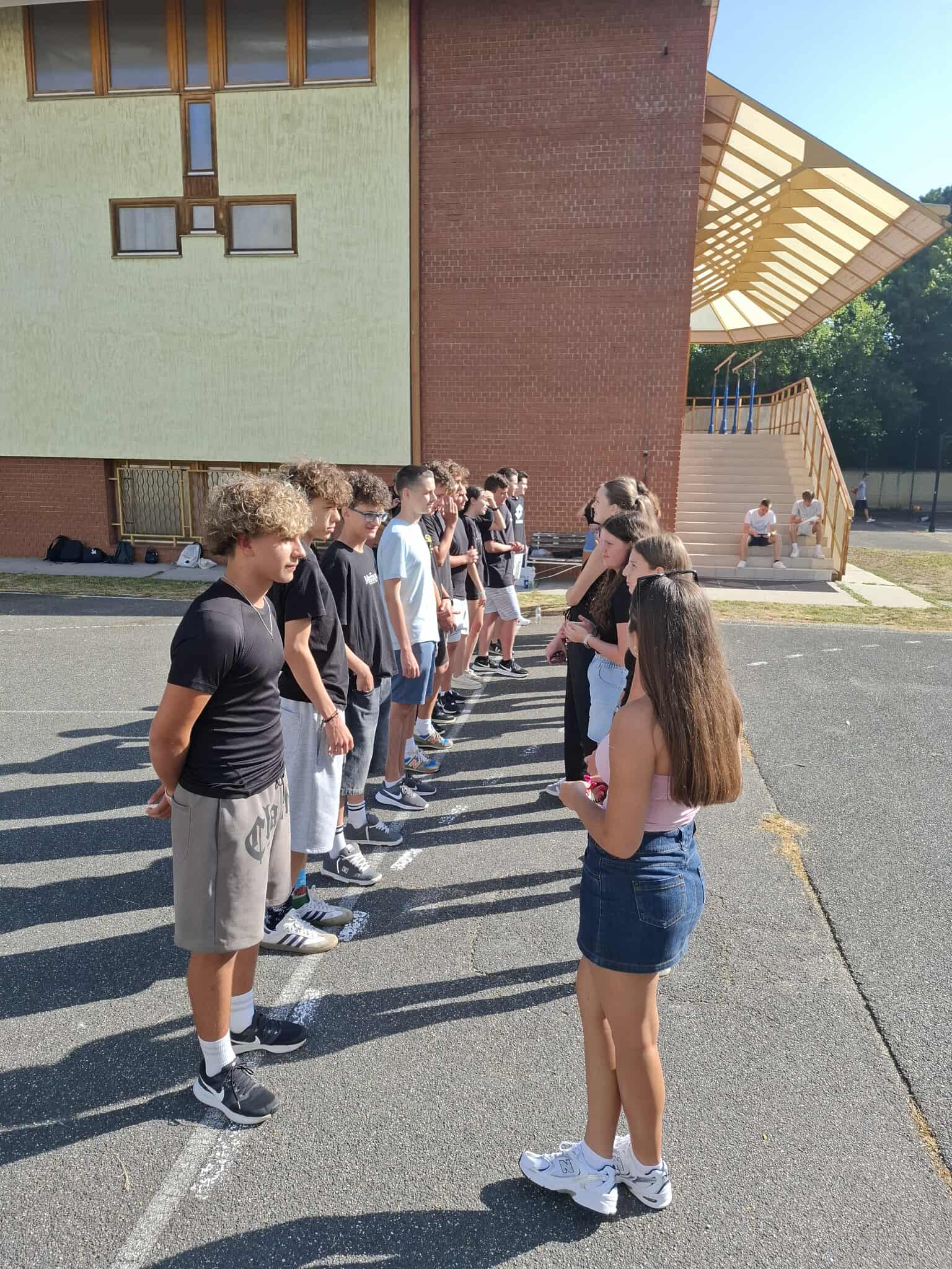 Két oszlopba állva, párt alkotva személyes kérdésekkel ismerkedtek egymással a gólyák.